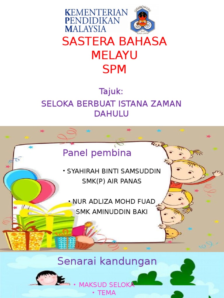 1AINA NATASHA BT ZULKEFLY 2NOORAFIFAH BT PAUZI 2. Share to Twitter Share to Facebook Share to Pinterest. Seloka Berbuat Istana Zaman Dahulu 7-8 B BENTUK DAN TEKNIK MENJAWAB SOALAN 9 C PRAKTIS TOPIKAL 1.