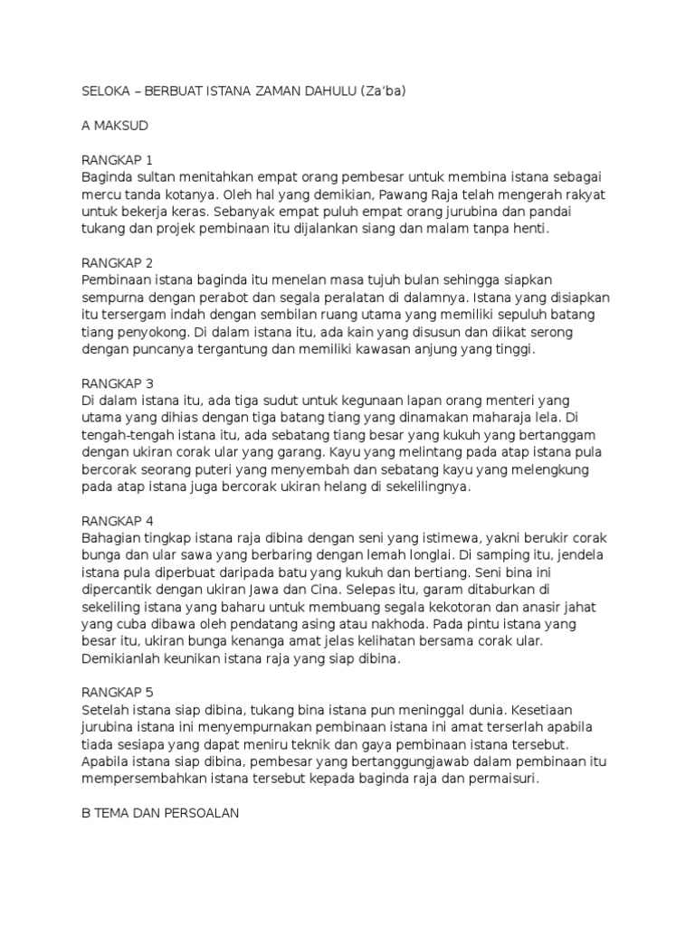 SELOKA BERBUAT ISTANA ZAMAN DAHULU Zaba A MAKSUD RANGKAP 1 Baginda sultan menitahkan empat orang pembesar untuk membina istana sebagai mercu tanda kotanya. Seloka tradisional BERBUAT ISTANA ZAMAN DAHULU ZABA DISEDIAKAN OLEH. Oleh hal yang demikian Pawang Raja telah mengerah rakyat untuk bekerja keras.